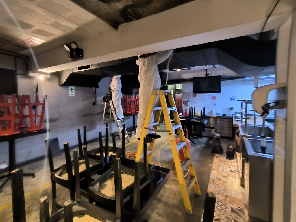 Mantenimiento integral del sistema de extracción de humos de cocina, que incluye la campana, ductos, precipitador, filtros de carbón activado, extractor, inyector y tablero eléctrico.