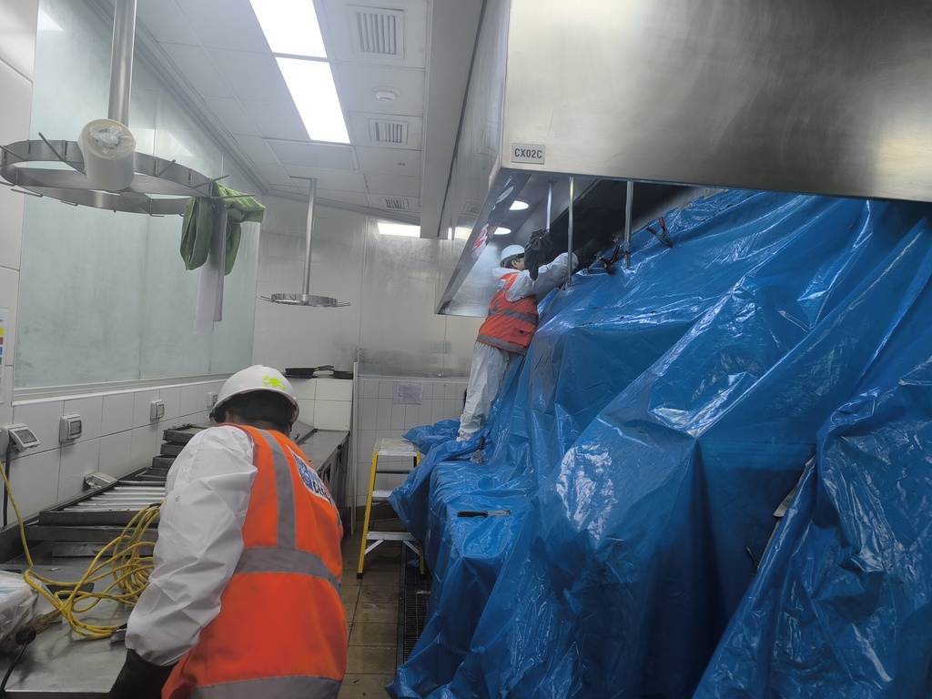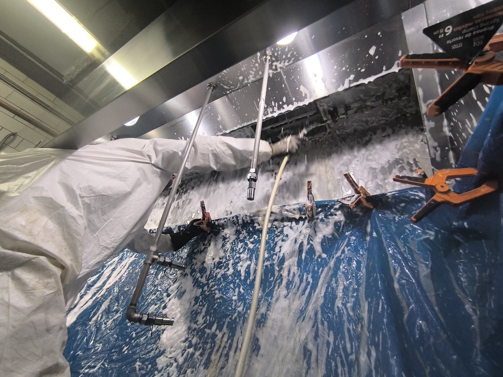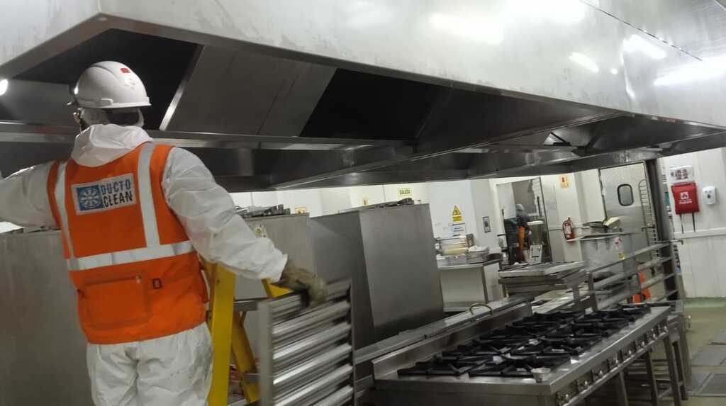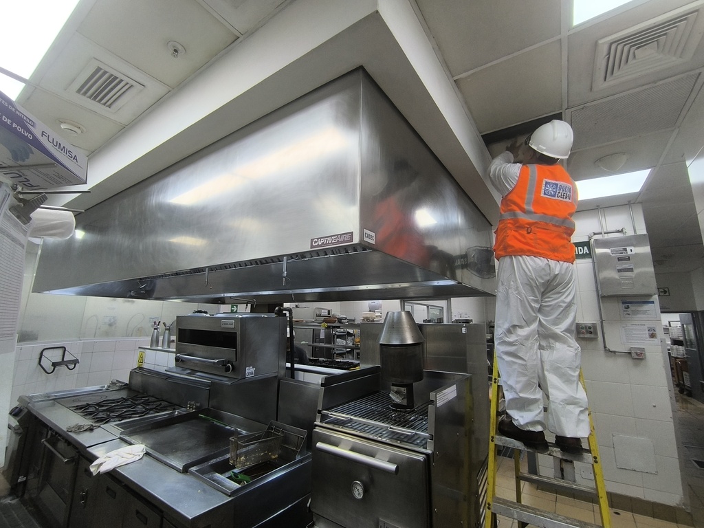 Mantenimiento integral del sistema de extracción de humos de cocina, que incluye la campana, ductos, precipitador, filtros de carbón activado, extractor, inyector y tablero eléctrico.